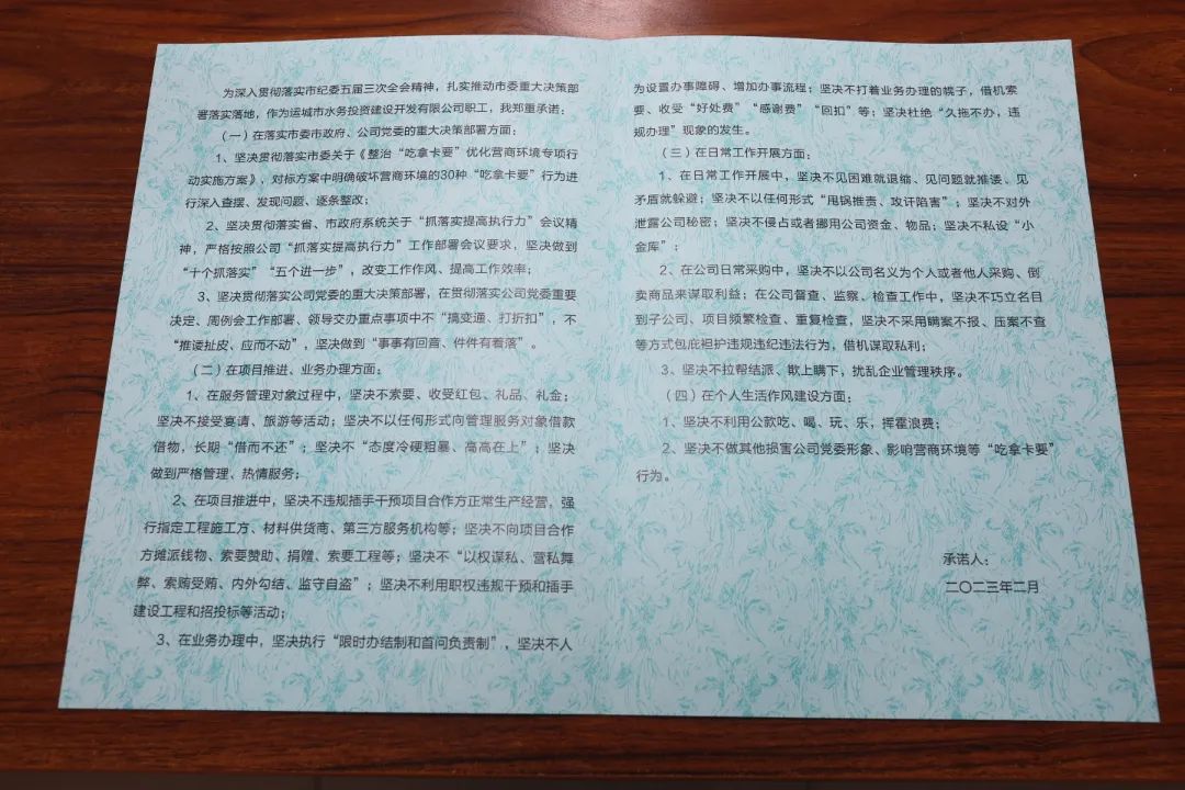 最后,黨委委員、紀委書記王望寬帶領全體參會人員進行整治“吃拿卡要”優(yōu)化營商環(huán)境專項行動集體承諾并簽訂《承諾書》。