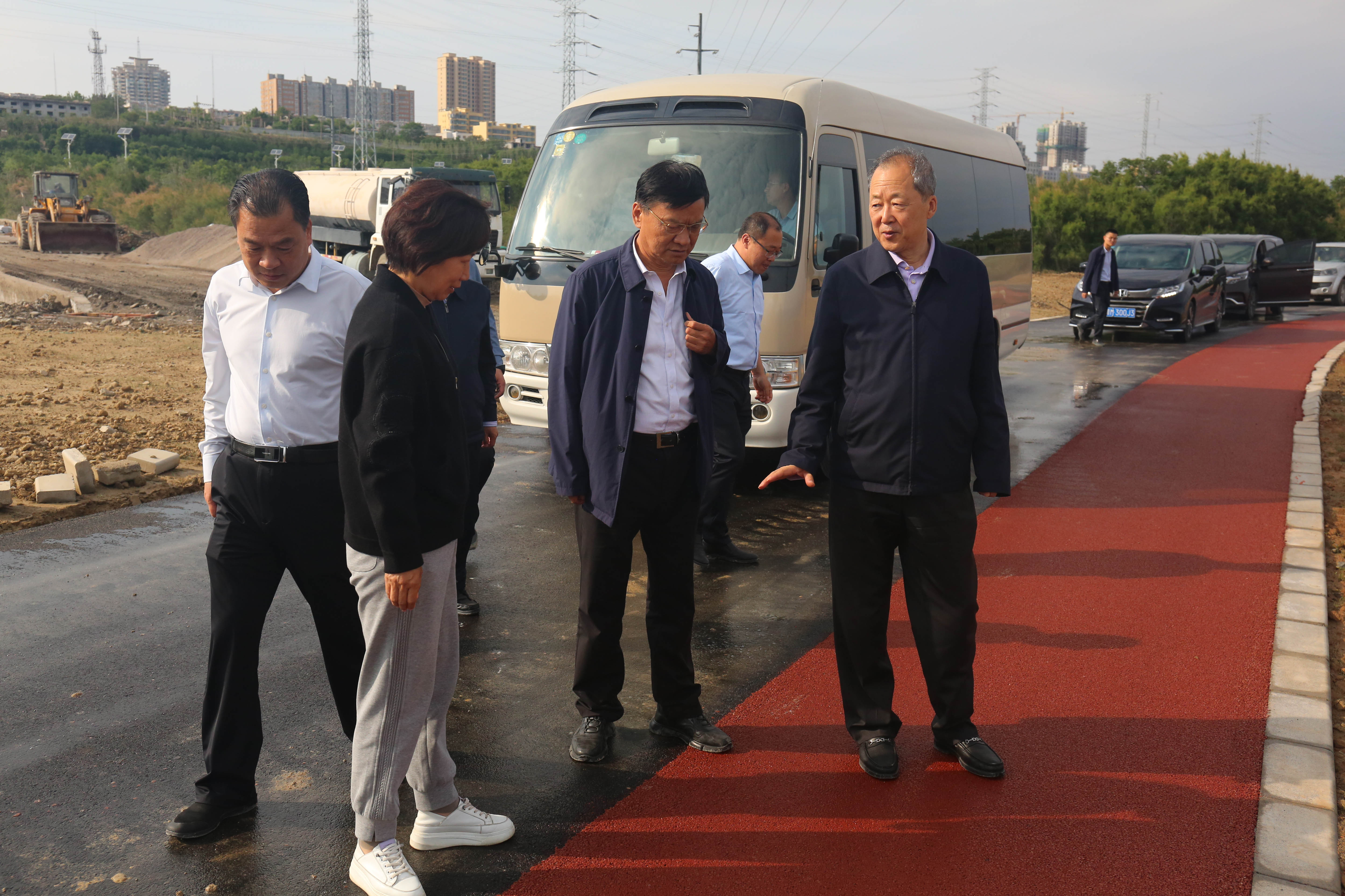 市委常委、副市長董旭光在鹽湖堤埝整治及生態(tài)修復(fù)項(xiàng)目工地查看環(huán)湖路鋪設(shè)情況