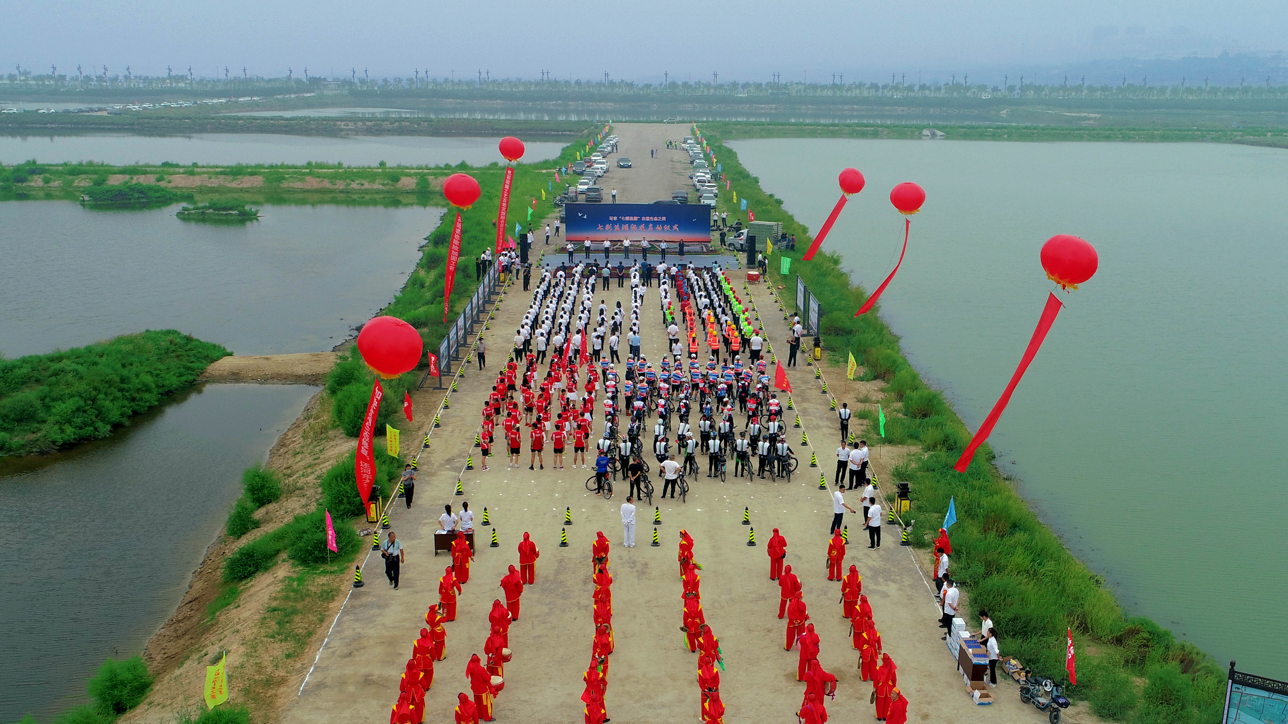 啟動(dòng)儀式由鹽湖生態(tài)保護(hù)與開發(fā)中心主任孫冬青主持,市人大、市政協(xié)、市紀(jì)委監(jiān)委、市委宣傳部、市委組織部、鹽湖區(qū)委、區(qū)政府等23家市、區(qū)相關(guān)單位和各參建單位參加了啟動(dòng)儀式。市水投公司董事長(zhǎng)崔作銘介紹了鹽湖堤埝除險(xiǎn)加固及生態(tài)修復(fù)(一期)項(xiàng)目建設(shè)概況,市委常委、副市長(zhǎng)董旭光宣布七彩鹽湖綠道啟動(dòng)。百 人齊聚,千鴿展翅競(jìng)飛,共同見證了這一激動(dòng)人心的歷史時(shí)刻。同時(shí)在這里開展了百人酷跑和騎行團(tuán)隊(duì)綠色環(huán)湖行。