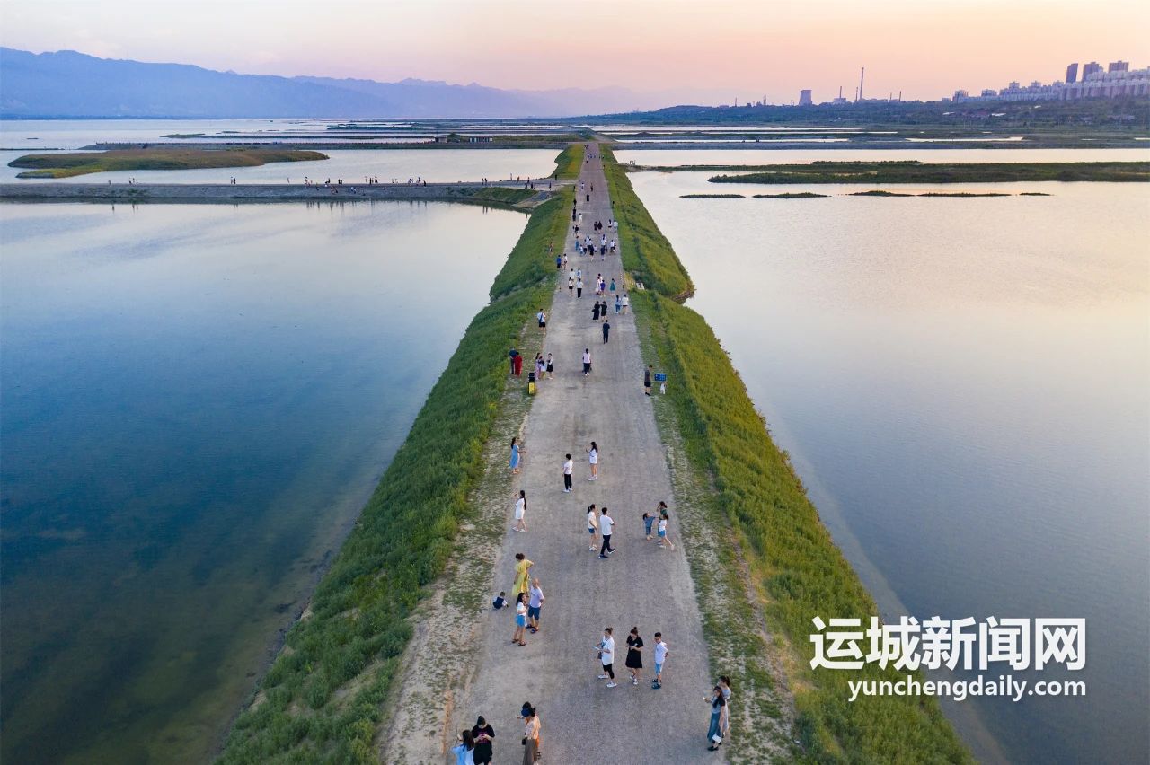 清晨6點,中條山下涼風(fēng)習(xí)習(xí),靜謐清麗。但圍繞鹽湖岸畔的步道上,穿著清涼晨跑的,扯著嗓子練聲的,舉著相機拍照的,人來人往,生命涌動的力量激蕩著黎明的寧靜。待清晨的第一縷陽光瀉向湖面,自帶柔光濾鏡,碧波浩渺,遠山蒼茫,美得不可方物。