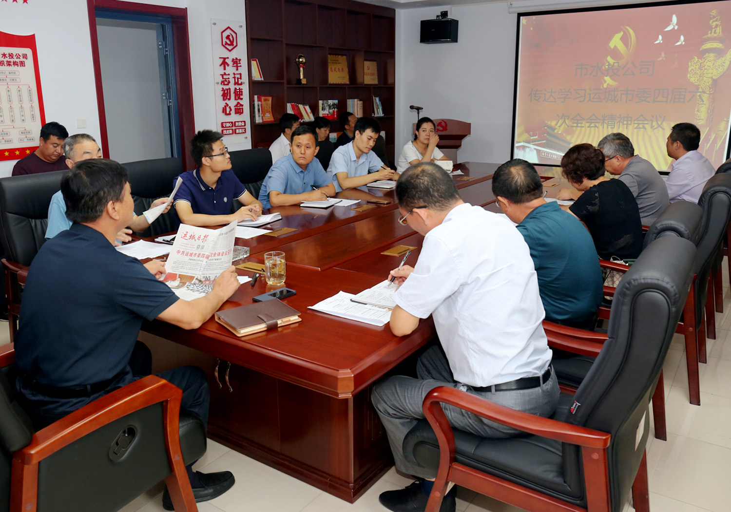 公司黨委書記崔作銘傳達了市委書記劉志宏在市委四屆六次會議上的講話精神。通過學習,大家對我市近年來全面從嚴治黨取得的成效有了深入了解,對當前和今后一段時期堅持和加強黨的全面領(lǐng)導,以黨的政治建設(shè)為統(tǒng)領(lǐng),強化黨要管黨、全面從嚴治黨的方針有了深刻認識,為公司今后的工作指明了方向。黨委書記崔作銘強調(diào):一要鞏固黨的全面領(lǐng)導地位,堅持以習近平新時代中國特色社會主義思想為指導,深入貫徹新時代黨的建設(shè)總要求,認真貫徹落實市委四屆六次全會精神,推動全面從嚴治黨向縱深發(fā)展。二要全面加強黨的政治建設(shè),進一步增強“四個意識”,堅定“四個自信”,堅決做到“兩個維護”,以“不忘初心、牢記使命”主題教育活動為契機,深入推進干部作風轉(zhuǎn)變。三要繼續(xù)做好公司當前各項工作,對照年初重點工作承諾,認真抓好“踐諾”,高質(zhì)、高效完成公司水系項目建設(shè)工程。
