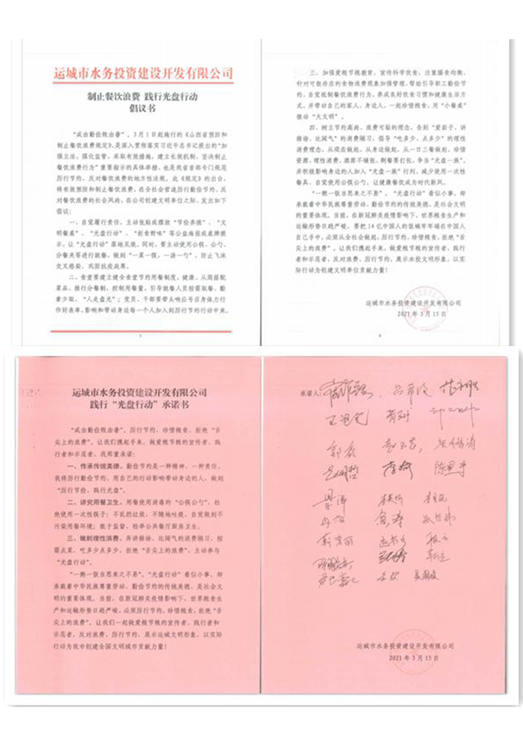 為響應(yīng)中央、省、市堅(jiān)決制止餐飲浪費(fèi)行為的號(hào)召,水投公司積極按文件要求,采取多種形式進(jìn)行宣傳落實(shí)。3月16日,公司以“制止餐飲浪費(fèi)、踐行光盤行動(dòng)”為主題,組織開展了系列活動(dòng),在公司及項(xiàng)目公司餐廳張貼公益海報(bào),在公司大廳一樓大屏幕播放宣傳語(yǔ)。同時(shí),在公司微信群發(fā)送了制止餐飲浪費(fèi)、踐行光盤行動(dòng)倡議書及承諾書,全體干部職工紛紛響應(yīng),簽署了《制止餐飲浪費(fèi)、踐行光盤行動(dòng)承諾書》。